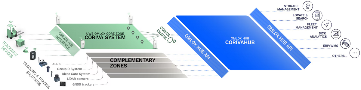 Location Management lays the foundation for transparent and efficient material flow by tracking and tracing assets in real time. CorivaHub is a core software solution for location management that transforms location data into standardized, globally consistent geographic coordinates. Based on the omlox hub standard, location data is sourced from various providers and locating technologies such as UWB, WLAN, GNSS, WPAN and RFID.